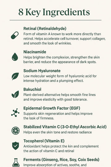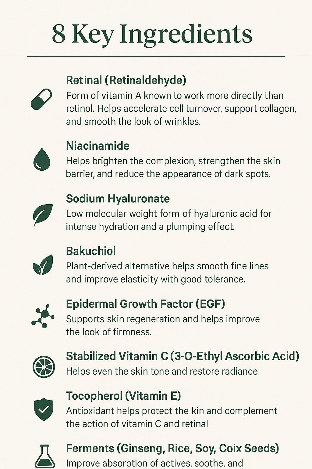 - المكونات الرئيسية: ريتينال ليبوزومي، ببتيدات، نياسيناميد، حمض الهيالورونيك